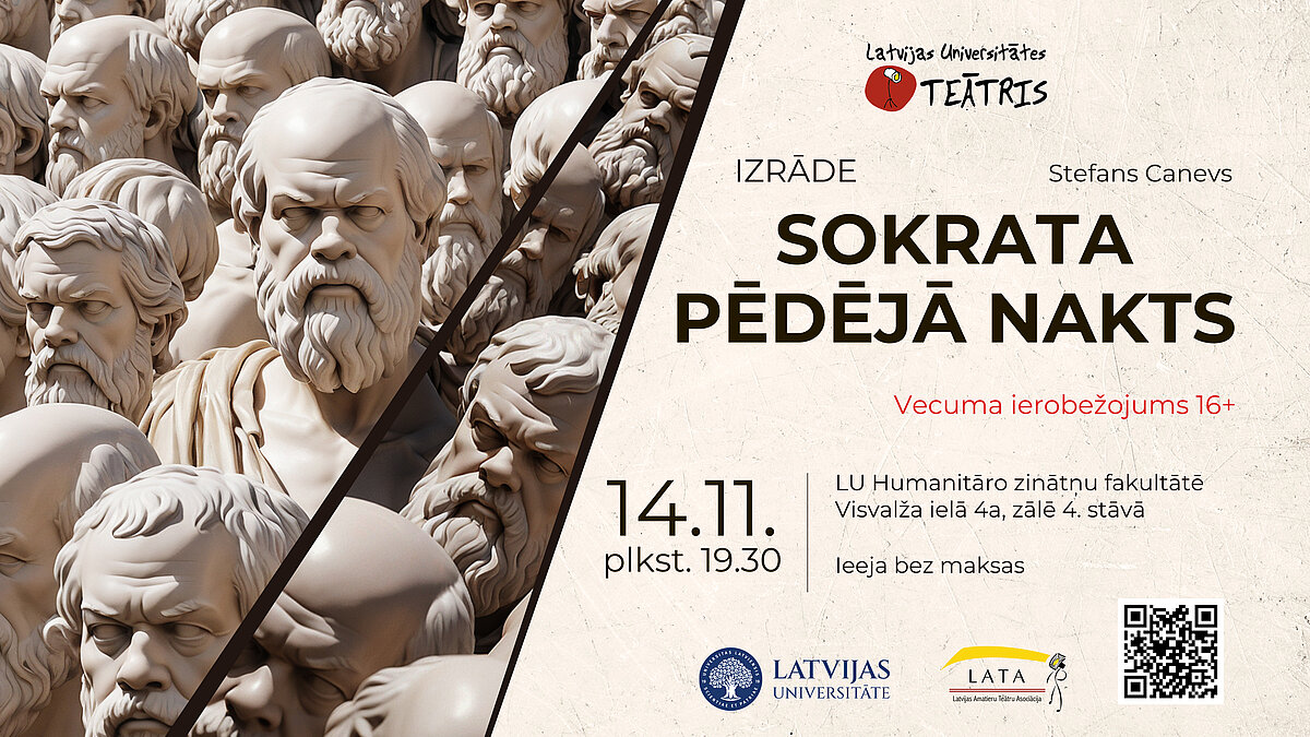 Izrāde “Sokrata pēdējā nakts” notiks 14. novembrī plkst. 19.30-20.45 LU Humanitāro zinātņu fakultātē, Visvalža ielē 4a, 4. stāva zāle (401. telpa).