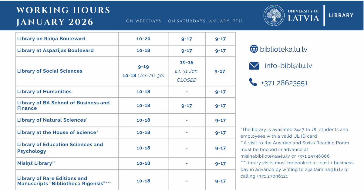 The Social Sciences Library on Lauva Street will be open on weekdays from 9:00 to 19:00 and on Saturdays from 10:00 to 15:00 from January 3 to 23. On January 17 (postponed working day), the library will be open from 9:00 to 17:00, but on January 24 it will be closed. From January 27 to 31, the working hours will be from 10:00 to 18:00, while on January 31 the library will be closed.