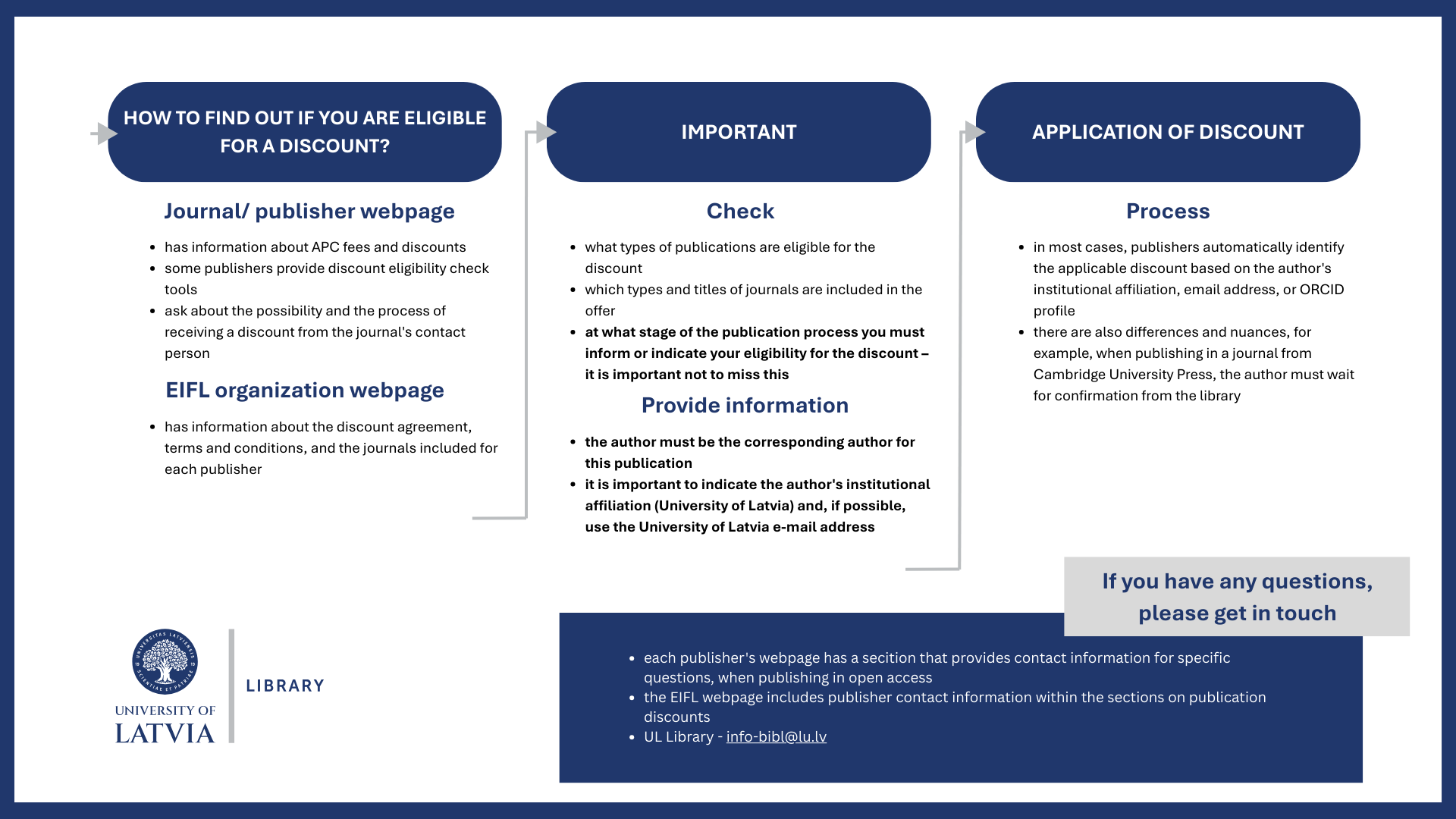 The University of Latvia Library (UL Library) encourages corresponding authors from the University of Latvia to take advantage of the opportunity to publish scientific articles in open access with article processing charges (APC) discount. This offer is made possible by Latvia's membership in the EIFL organization, which has negotiated with several scientific publishers and offers authors the opportunity to receive discounts when publishing articles in open access scientific journals.
