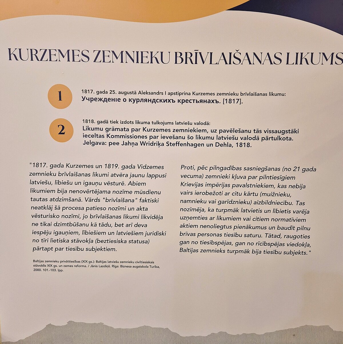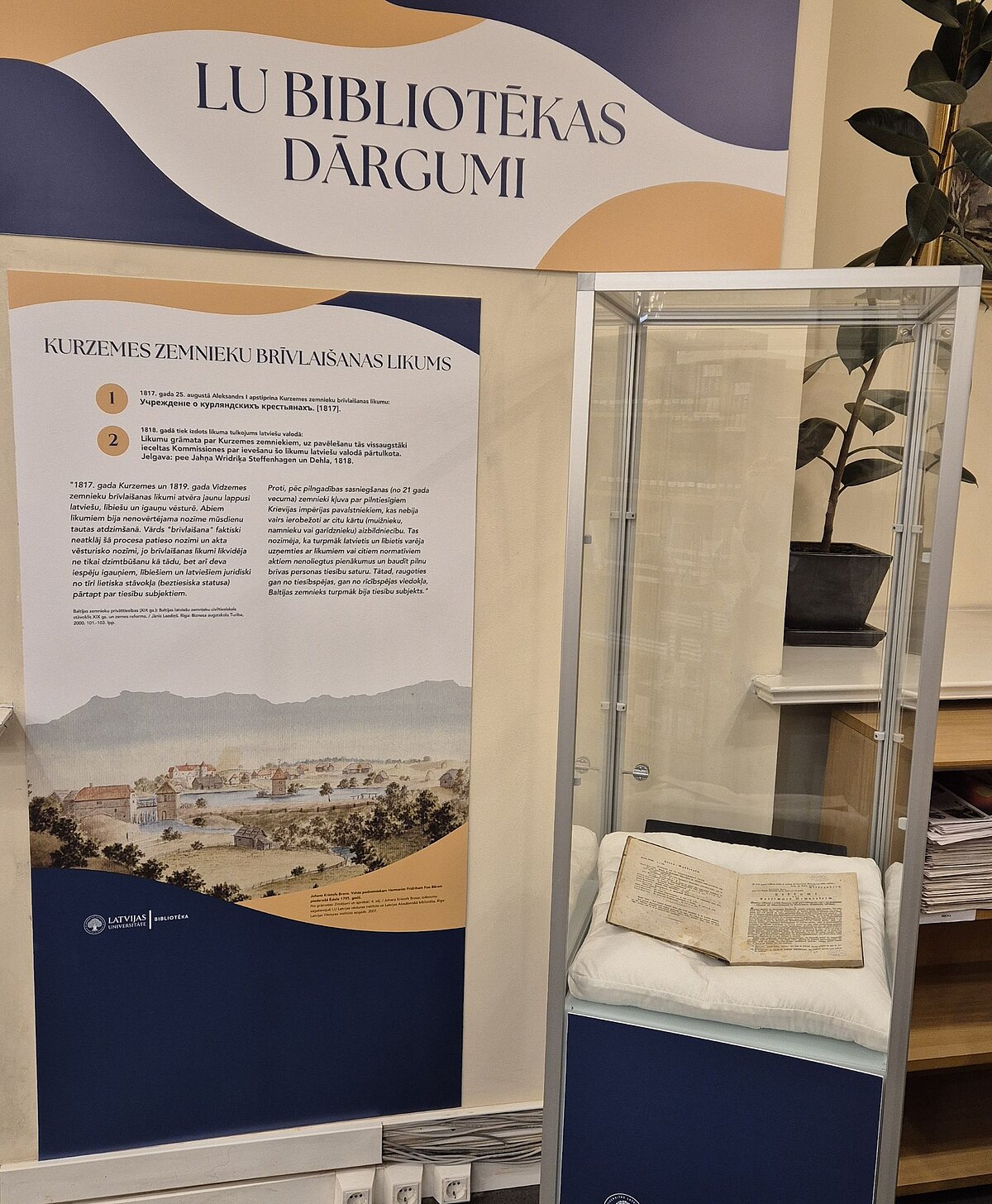 No decembra līdz februāra beigām LU bibliotēkā Raiņa bulvārī būs apskatāms vēsturisks izdevums – Kurzemes zemnieku brīvlaišanas likums “Likkumu-grahmata par Kursemmes semneekeem, us pawehleschanu tahs wissaugstaki eezeltas Kommissiones par eeweschanu scho likkumu latweeschu wallodā pahrtulkota” [Likumu grāmata par Kurzemes zemniekiem, uz pavēlešanu tās vissaugstāki ieceltas Kommissiones par ievešanu šo likumu latviešu valodā pārtulkota].