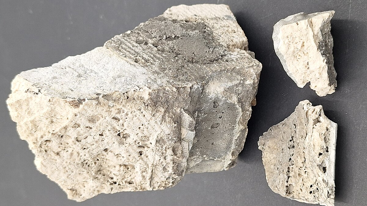 1. att. Travertīns no restaurējamās pieminekļa detaļas. LUM nodevusi I. Sidraba 2000. gadā. Foto: V. Hodireva